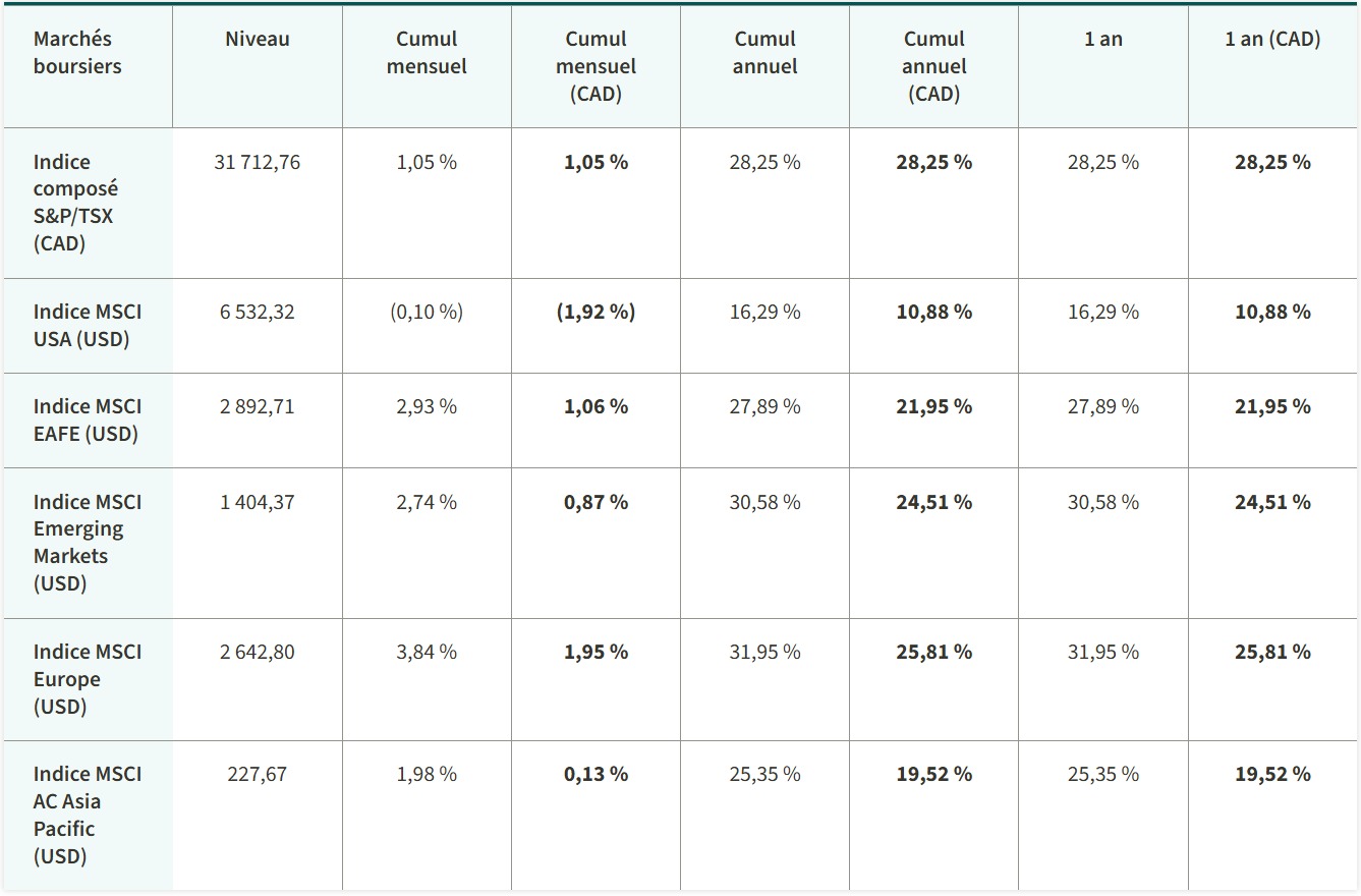 L’indice composé S&P/TSX a été entraîné à la hausse par le secteur des services financiers. Les actions états-uniennes ont un peu baissé. Les rendements des obligations gouvernementales à 10 ans du Canada et des États-Unis ont augmenté. Le prix du pétrole a reculé, celui de l’or a monté.